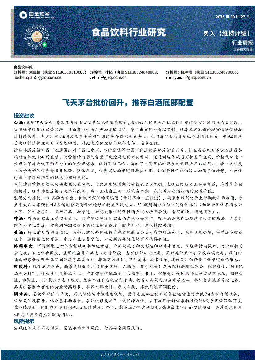 食品饮料行业:国金证券-食品饮料行业周报:飞天茅台批价回升,推荐白酒底部配置-250927