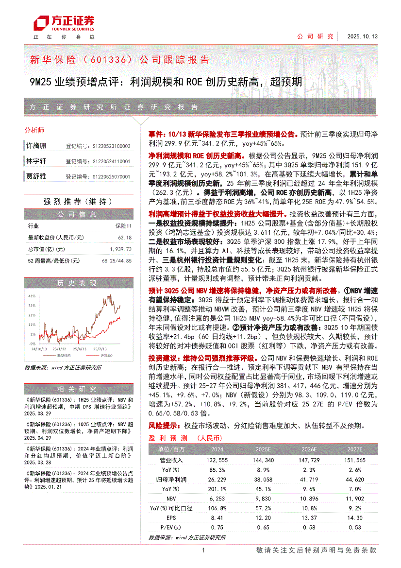 新华保险:方正证券-新华保险-601336-公司跟踪报告:9M25业绩预增点评,利润规模和ROE创历史新高,超预期-251013