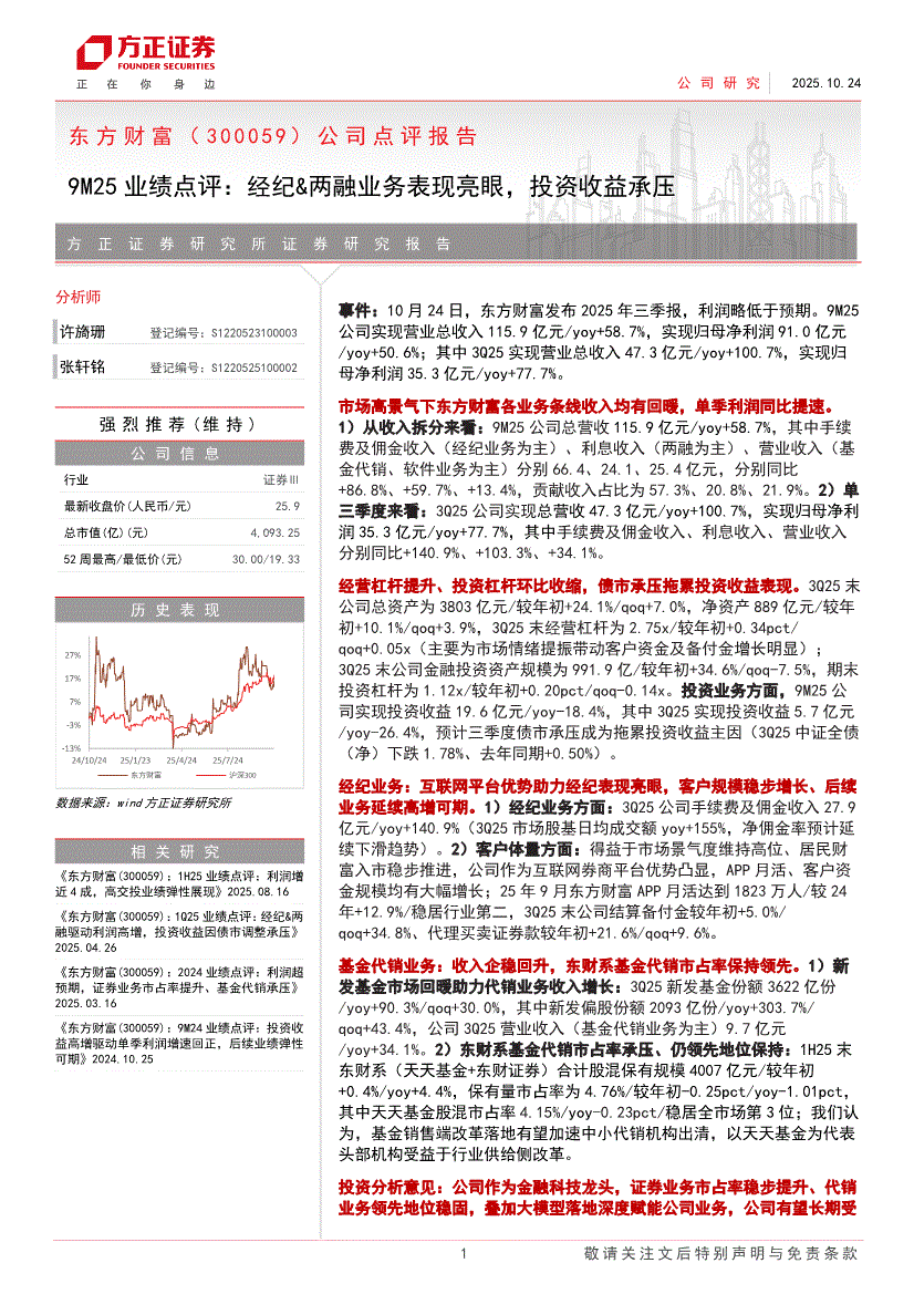 方正证券-东方财富-300059-公司点评报告:9M25业绩点评,经纪&两融业务表现亮眼,投资收益承压-251024