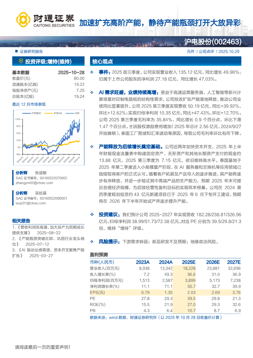 沪电股份:财通证券-沪电股份-002463-加速扩充高阶产能,静待产能瓶颈打开大放异彩-251029