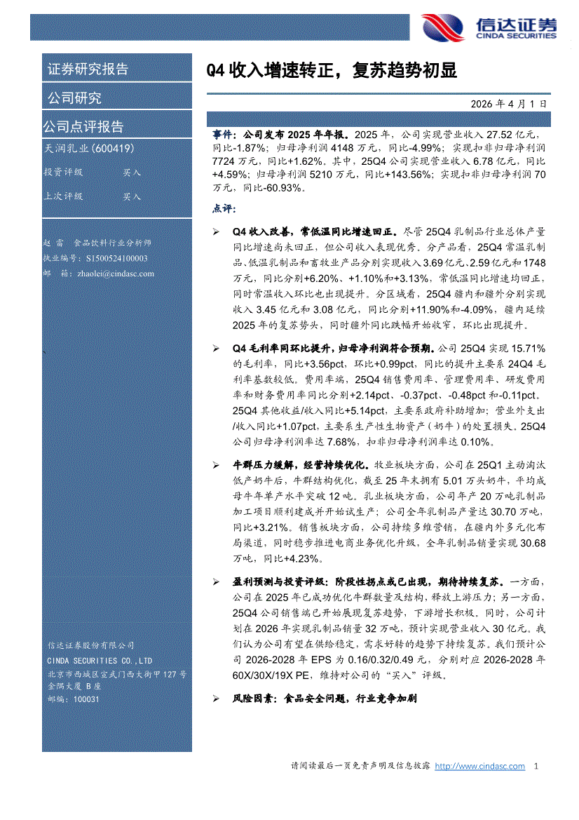 天润乳业:信达证券-天润乳业-600419-Q4收入增速转正,复苏趋势初显-260401