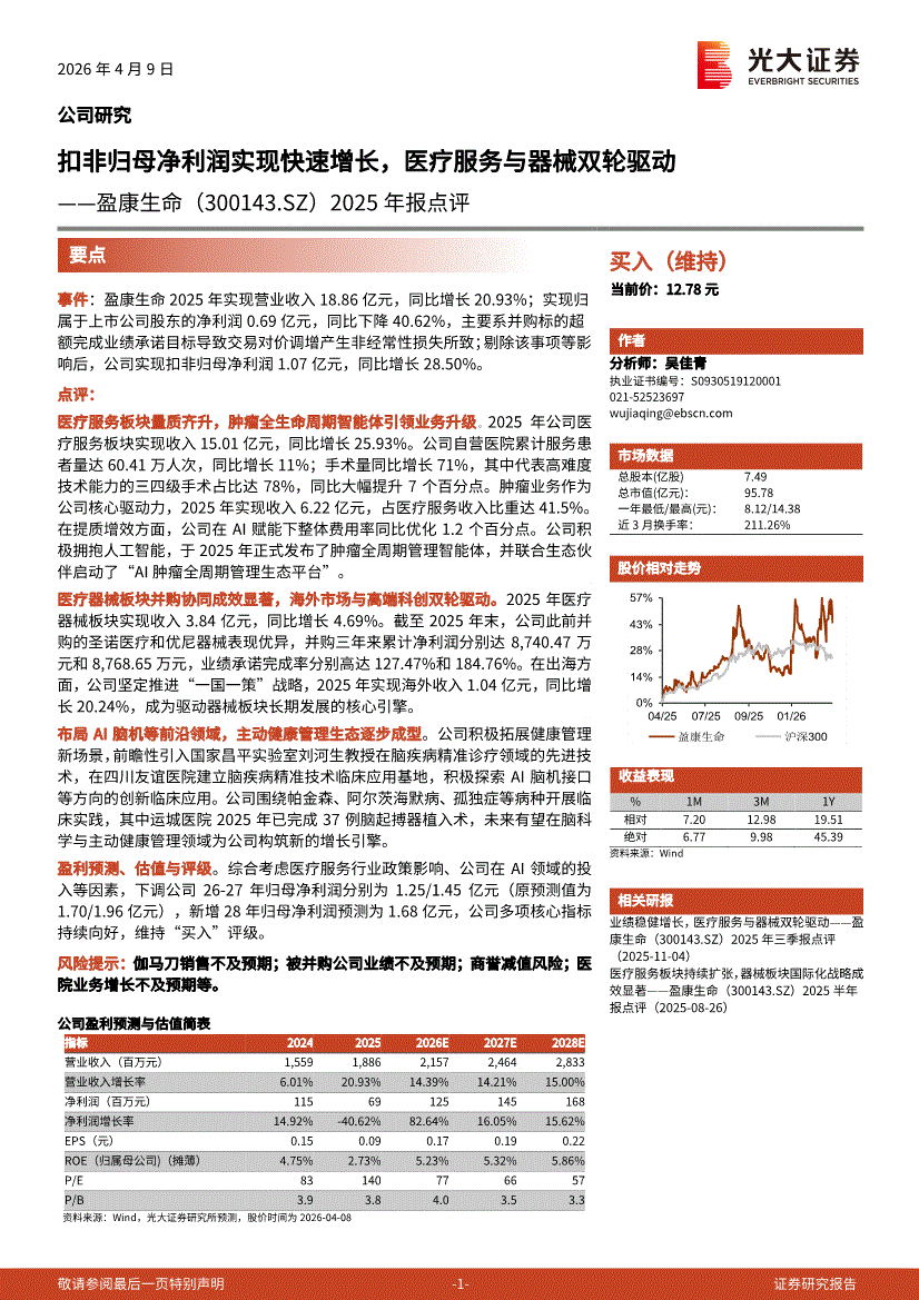 盈康生命:光大证券-盈康生命-300143-2025年报点评:扣非归母净利润实现快速增长,医疗服务与器械双轮驱动-260409