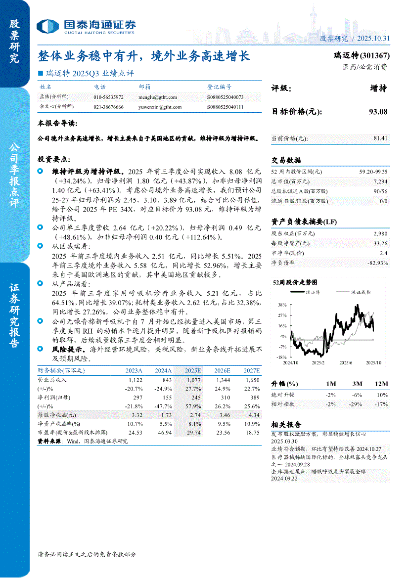 瑞迈特:国泰海通证券-瑞迈特-301367-2025Q3业绩点评:整体业务稳中有升,境外业务高速增长-251031